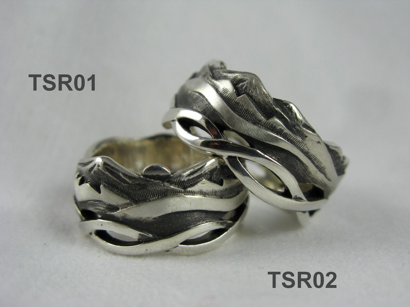 Handmade sterling silver band style ring inspired by the Three Sisters mountain range of Oregon and river motif. Antiqued with polished and satin finish. Stock size 7.